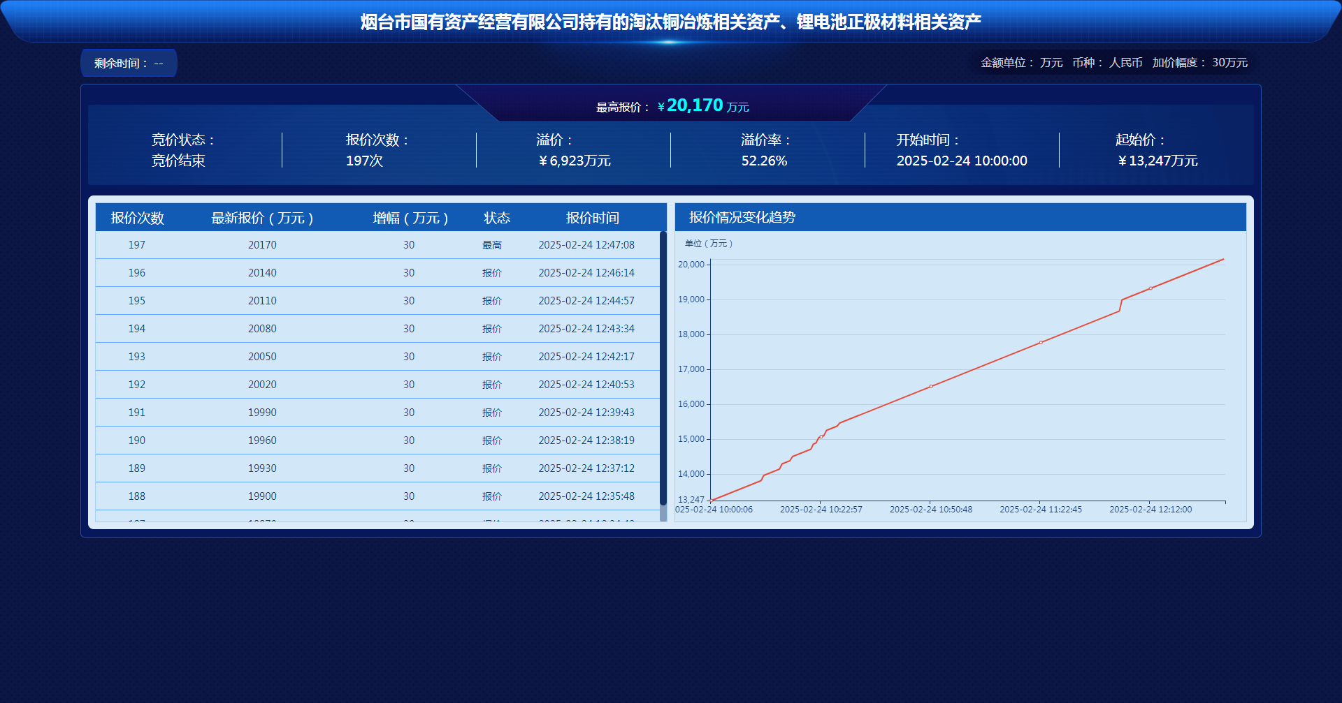 2月24日,“煙臺市國有資產(chǎn)經(jīng)營有限公司持有的淘汰銅冶煉相關資產(chǎn)、鋰電池正極材料相關資產(chǎn)項目”在山東產(chǎn)權交易中心以網(wǎng)絡競價方式成功出讓。此次交易歷經(jīng)197輪激烈競價,持續(xù)近3小時,最終成交金額定格在20170萬元,高于評估價8980萬元,較掛牌價溢價6923萬元,溢價率高達52.26%,成功創(chuàng)下煙臺聯(lián)合產(chǎn)權2025年首季資產(chǎn)盤活的“開門紅”。
